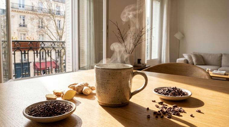 Pour le gingembre, privilégiez la décoction légère ou râpez-le finement avant de verser l’eau. Cela permet de libérer les gingérols responsables de l’effet anti-inflammatoire. Si vous optez pour le cacao (le vrai, cru et non sucré), ne le brûlez pas avec une eau à 100°C. Une température plus douce préserve ses antioxydants et son magnésium, essentiels pour la récupération musculaire et la gestion du stress.